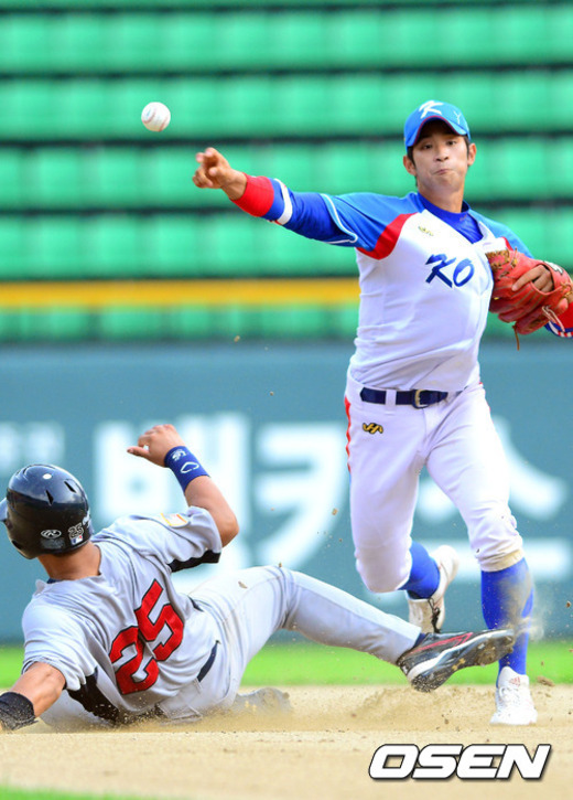 1일 오후 서울 잠실구장에서 열린 '세계청소년야구선수권대회' 한국과 미국의 경기, 6초 무사 1루 한국 강승호가 1루 주자 마르티네즈를 포스 아웃시키고 1루로 송구하고 있다.