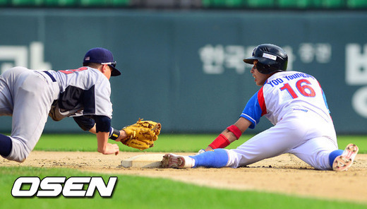 1일 오후 서울 잠실구장에서 열린 '세계청소년야구선수권대회' 한국과 미국의 경기, 6말 1사 1루 한국 유영준이 2루 도루를 성공하고 심판을 바라보고 있다.