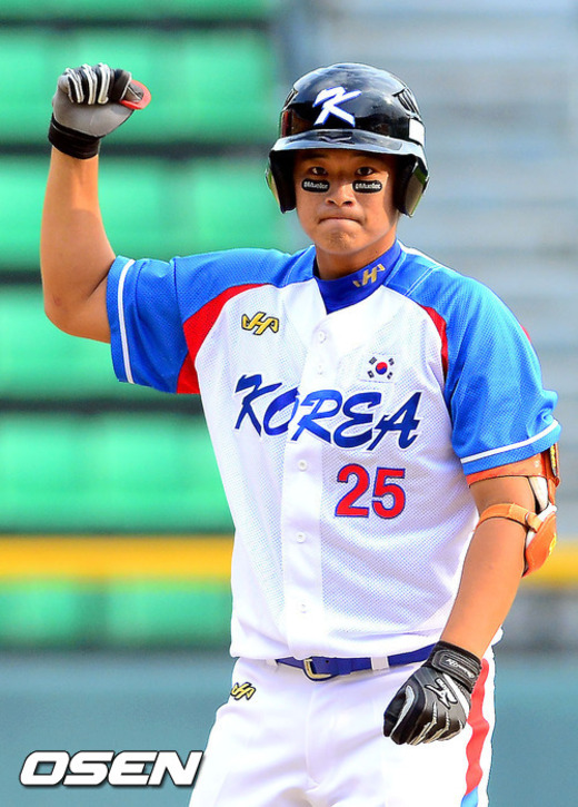 1일 오후 서울 잠실구장에서 열린 '세계청소년야구선수권대회' 한국과 미국의 경기, 6회말 2사 만루 한국 윤대영이 싹슬이 3타점 2루타를 때리고 기뻐하고 있다.