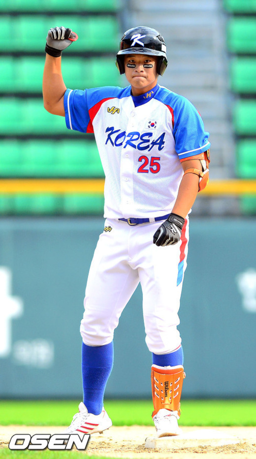 1일 오후 서울 잠실구장에서 열린 '세계청소년야구선수권대회' 한국과 미국의 경기, 6회말 2사 만루 한국 윤대영이 싹슬이 3타점 2루타를 때리고 기뻐하고 있다.