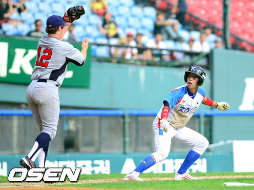 1일 오후 서울 잠실구장에서 열린 '세계청소년야구선수권대회' 한국과 미국의 경기, 6회말 1사 1,3루 한국 유영준이 3루 런다운에 걸려 태그 아웃당하고 있다.