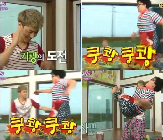 이기광은 1일 방송된 KBS 2TV 예능프로그램 '청춘불패'에 출연, 효연(소녀시대)에게 이영자를 들어보라는 요구를 받았다. 꾸준한 운동으로 몸과 힘이 좋기로 유명한 이기광인만큼 기대가 됐던 상황.