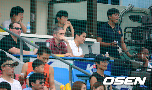 1일 오후 광주 무등야구장에서 열린 '2012 팔도 프로야구' KIA 타이거즈와 한화 이글스의 경기, 야구장을 찾은 MLB 스카우트가 KIA 윤석민의 투구를 바라보고 있다.