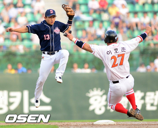 1일 오후 인천 문학구장에서 열린 '2012 팔도 프로야구' SK 와이번스와 두산 베어스의 경기 4회말 1사 1루 박정권의 1루수 앞 병살타구를 송구 받은 유격수 손시헌이 2루에서 이호준을 태그아웃 시키고 있다.