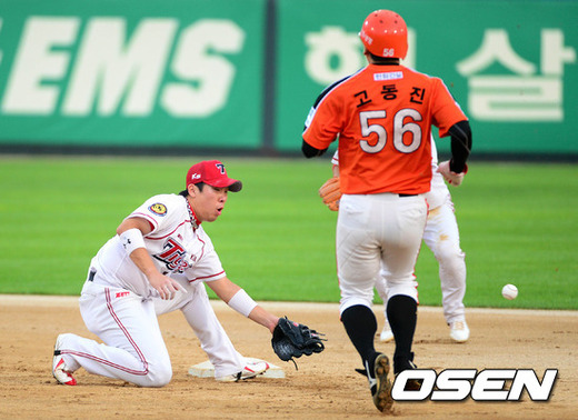 1일 오후 광주 무등야구장에서 열린 '2012 팔도 프로야구' KIA 타이거즈와 한화 이글스의 경기, 5회초 2사 1루 1루주자 한화 고동진의 도루때 KIA 안치홍이 송구를 놓치고 있다.