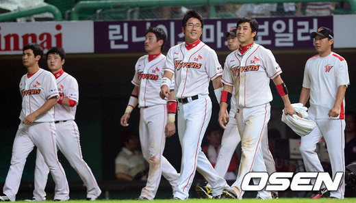 1일 오후 인천 문학구장에서 열린 '2012 팔도 프로야구' SK 와이번스와 두산 베어스의 경기 종료 후 SK 선수들이 관중들에게 인사를 하기 위해 그라운드로 걸어 나오고 있다.