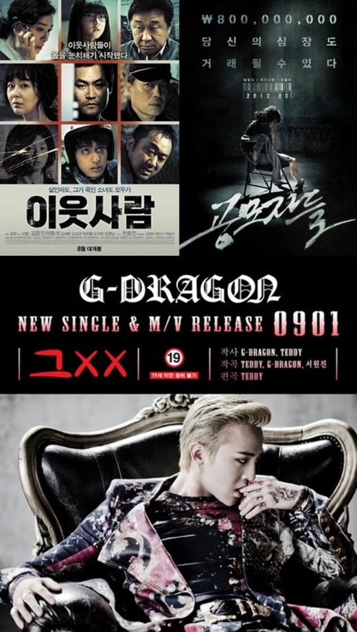웰메이드 스릴러로 극장가를 사로잡고 있는 영화 '공모자들'과 '이웃사람'이 나란히 1, 2위를 달리며 쌍끌이 흥행을 이어가는 가운데 가요계에선 그룹 빅뱅의 지드래곤이 19금 노래를 들고 나와 각종 음원 차트를 1위를 휩쓰는 기염을 토했다.