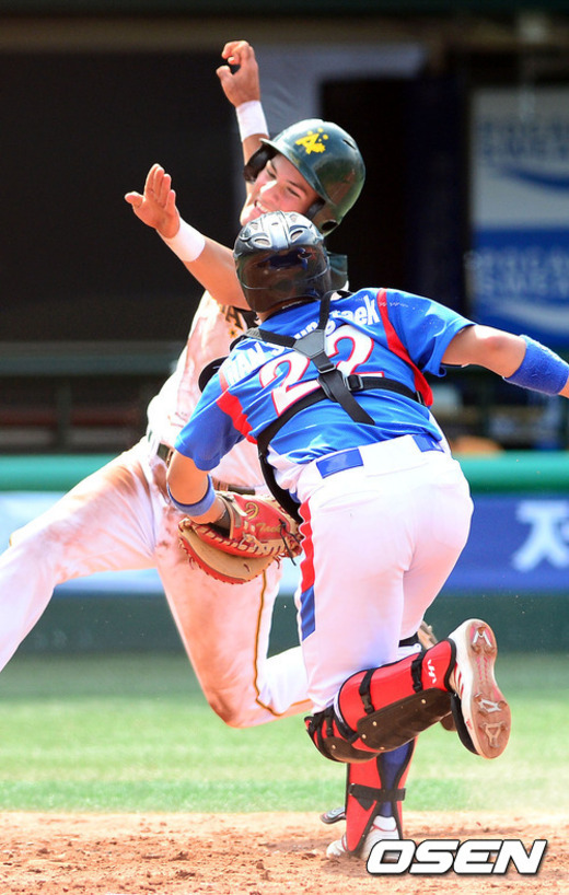 2일 오후 서울 목동구장에서 열린 '세계청소년야구선수권대회' 한국과 호주의 경기, 2회말 2사 2루 호주 하그래브스의 우전 안타 때 2루주자 케넬리가 홈까지 쇄도했으나 한국 김인태의 송구를 잡은 한승택이 태그 아웃시키고 있다.