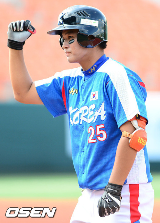 2일 오후 서울 목동구장에서 열린 '세계청소년야구선수권대회' 한국과 호주의 경기, 3회초 2사 2루 한국 윤대영이 1타점 적시타를 때리고 기뻐하고 있다.