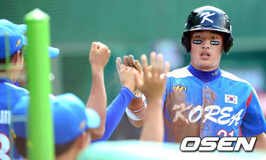 2일 오후 서울 목동구장에서 열린 '세계청소년야구선수권대회' 한국과 호주의 경기, 3회초 2사 2루 한국 2루 주자 김인태가 윤대영의 적시타로 홈을 밟은뒤 선수들과 기뻐하고 있다.