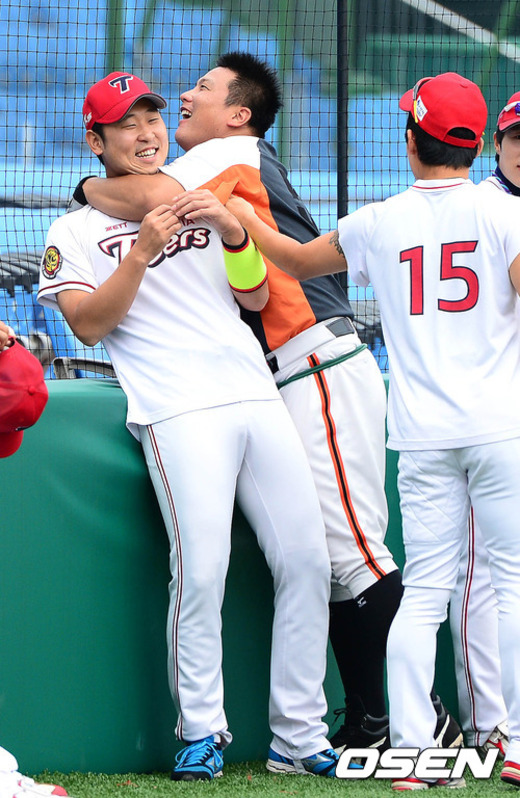 2일 오후 대전 한밭야구장에서 열린 '2012 팔도 프로야구' 한화 이글스와 KIA 타이거즈의 경기에 앞서 한화 김태균이 KIA 윤석민과 장난을 치고 있다.