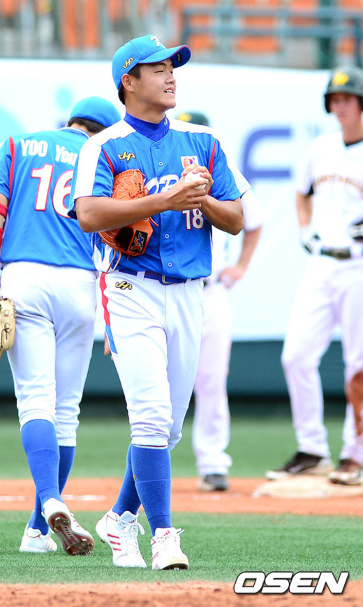 2일 오후 서울 목동구장에서 열린 '세계청소년야구선수권대회' 한국과 호주의 경기, 1회말 2사 1,3루 한국 장현식이 호주 타자들에게 연속 안타를 허용하고 씁쓸한 웃음을 짓고 있다.