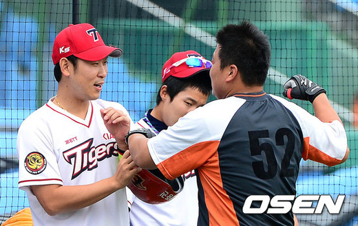 2일 오후 대전 한밭야구장에서 열린 '2012 팔도 프로야구' 한화 이글스와 KIA 타이거즈의 경기에 앞서 한화 김태균이 KIA 윤석민과 장난을 치고 있다.