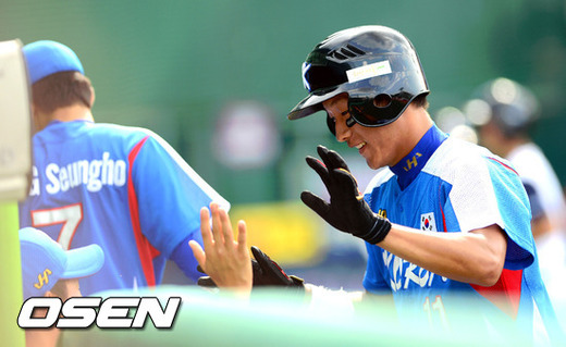 2일 오후 서울 목동구장에서 열린 '세계청소년야구선수권대회' 한국과 호주의 경기, 4회초 1사 3루 한국 유영준의 우전 안타때 3루 주자 송준석이 홈을 밟은뒤 선수들과 기뻐하고 있다.