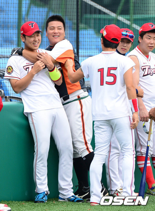 2일 오후 대전 한밭야구장에서 열린 '2012 팔도 프로야구' 한화 이글스와 KIA 타이거즈의 경기에 앞서 한화 김태균이 KIA 윤석민과 장난을 치고 있다.