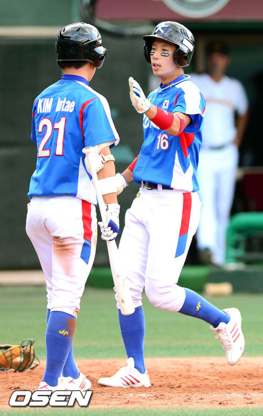 2일 오후 서울 목동구장에서 열린 '세계청소년야구선수권대회' 한국과 호주의 경기, 4초 1사 3루 한국 유영준이 호주 루이스 소프의 폭투로 홈을 밟은뒤 타자 김인태와 하이파이브를 하고 있다.