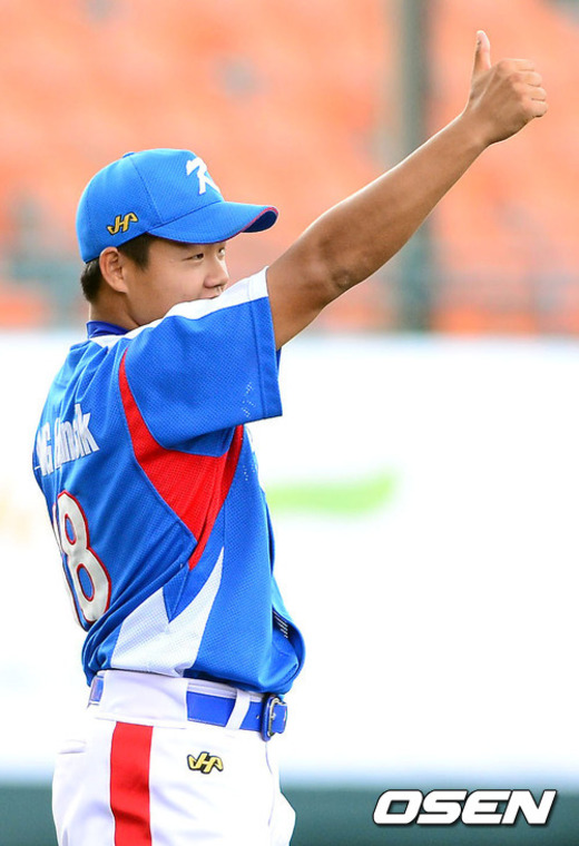 2일 오후 서울 목동구장에서 열린 '세계청소년야구선수권대회' 한국과 호주의 경기, 5회말 1사 한국 김인태가 호주 엘리엇 하그래브스의 홈런성 타구를 잡아내자 투수 장현식이 김인태에게 엄지 손가락을 펼치며 최고라는 사인을 보내고 있다.