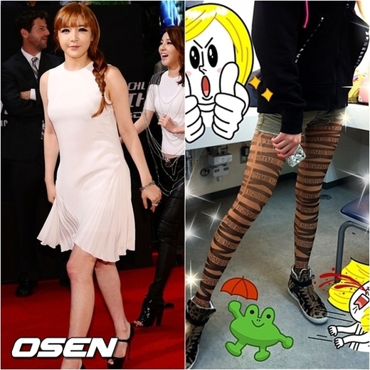 사진 속 박봄은 2NE1이 새겨진 스타킹을 신고 각선미를 뽐내고 있다. 길고 얇은 다리가 웬만한 다리모델보다 예쁘다는 게 팬들의 평.