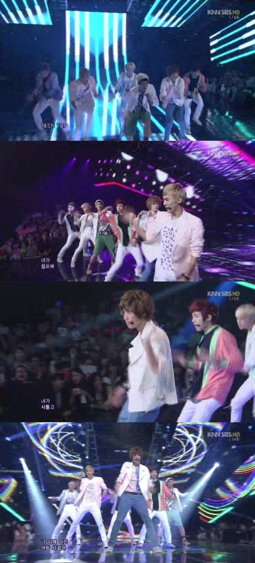 이날 틴탑은 남친돌답게 귀여움이 돋보이는 의상을 입고 올라 발랄함으로 무대를 꾸몄다. 특히 틴탑은 특유의 칼군무를 선보여 눈길을 사로잡았다.