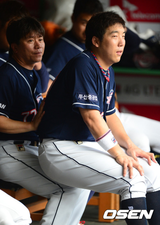 2일 오후 인천 문학구장에서 열린 '2012 팔도 프로야구' SK 와이번스와 두산 베어스의 경기, 경기전 두산 김현수가 경기를 기다리며 전형도 코치의 무릎에 앉아 그라운드를 바라보고 있다.