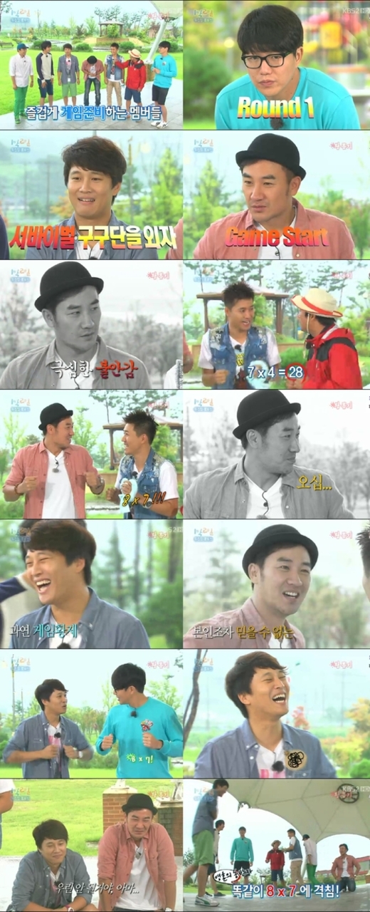 첫 번째 게임은 ‘서바이벌 구구단을 외자’였다. 가장 먼저 탈락한 사람은 바로 엄태웅. 엄태웅은 옆에 있던 멤버가 “8X7은?”이라고 묻자 “50”이라고 말해 탈락, 큰 웃음을 안겼다.