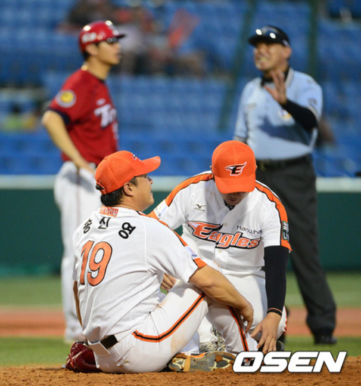 2일 오후 대전 한밭야구장에서 열린 '2012 팔도 프로야구' 한화 이글스와 KIA 타이거즈의 경기, 5회초 KIA 김선빈의 타구에 맞은 한화 송신영이 고통스러워하고 있다.