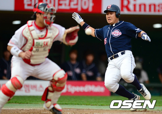 2일 오후 인천 문학구장에서 열린 '2012 팔도 프로야구' SK 와이번스와 두산 베어스의 경기, 5회초 1사 2루에서 두산 양의지가 이종욱의 적시타에 홈에서 슬라이딩하며 세이프되고 있다.