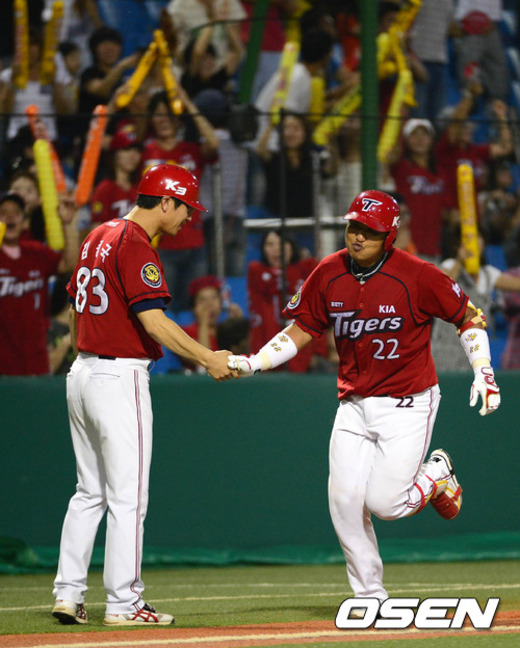 2일 오후 대전 한밭야구장에서 열린 '2012 팔도 프로야구' 한화 이글스와 KIA 타이거즈의 경기, 6회말 1사 만루 KIA 김상훈이 4점홈런을 치고 김종국 코치와 하이파이브를 하고 있다.