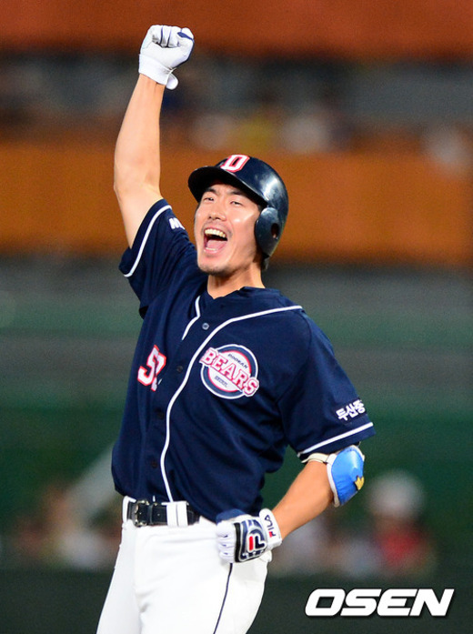 2일 오후 인천 문학구장에서 열린 '2012 팔도 프로야구' SK 와이번스와 두산 베어스의 경기, 9회초 1사 2루에서 두산 김재호가 적시 2루타를 날리고 기뻐하고 있다.