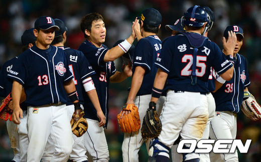 경기후 승리한 두산 선수들이 하이파이브를 하고 있다. /jpnews@osen.co.kr