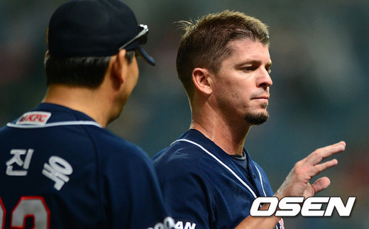 경기후 승리한 두산 김진욱 감독이 마무리 프록터를 격려하고 있다. 프록터는 8회말 2사 1,2루에서 니퍼트에 이어 등판했지만 SK 김강민에 동점타를 허용했다. /jpnews@osen.co.kr