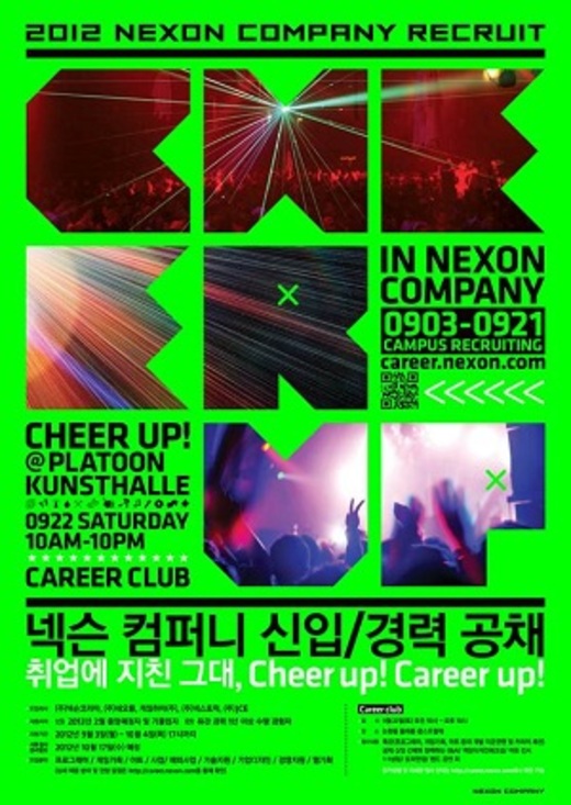 넥슨은 3일 '치어 업(Cheer Up)'을 주제로 게임하이 네오플 넥스토릭 넥슨 JCE등 넥슨 컴퍼니 5개사가 2012년 하반기 신입 경력사원 공개채용을 시작한다고 발표했다.