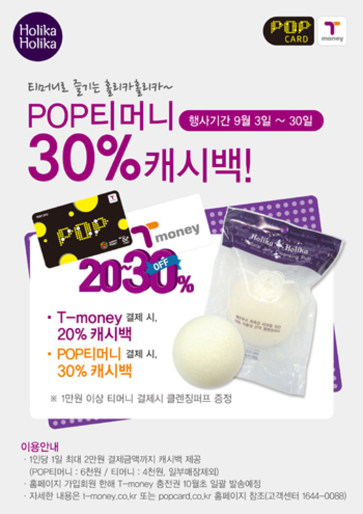 홀리카홀리카는 간편하게 사용할 수 있는 카드의 편리함과 연계된 이벤트로 팝카드 결제 시 30% 캐시백을, 일반 티머니 결제 시에는 20% 캐시백 혜택을 준다. 더불어 1만 원 이상 POP카드로 결제 시(티머니 포함) 곤약 클렌징 퍼프를 증정한다. (단, 팝카드의 캐시백 경우 1인당 1일 최대 2만원 결제 금액 금액까지 제공)
