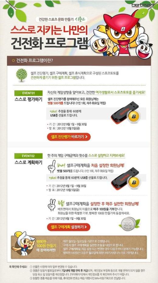 이벤트 1 ‘스스로 평가하기’는 고객이 스포츠토토를 건전한 여가생활로 즐겁게 이용할 수 있도록 유도하기 위해 기획된 이벤트로 베트맨 회원은 ‘셀프진단평가’를 통해 스스로 얼마나 게임에 몰입하고 있는지 게임성향을 진단하고 평가해 자신의 게임몰입도를 점검할 수 있다. 이벤트 2 ‘스스로 계획하기’는 고객의 계획성 있는 구매를 유도하여 과도한 구매를 방지하기 위하여 기획되었다. 베트맨 회원은 ‘셀프구매계획’의 참여를 통해 회원 스스로 한 주 동안 구매금액 한도와 횟수를 미리 설정할 수 있다.