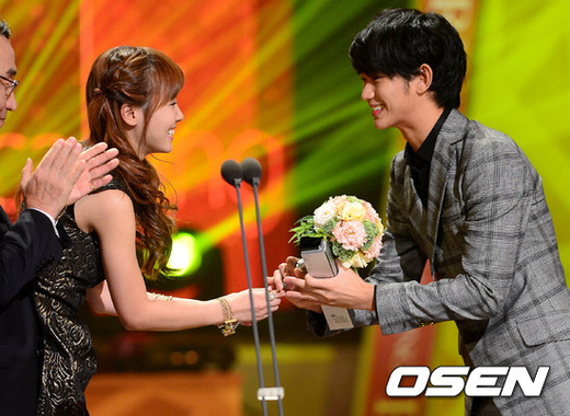 [OSEN = 백승철 기자] 3일 오후 서울 여의도동 KBS홀에서 열린 제39회 한국방송대상 시상식에서 연기자부문 탤런트상을 받은 김수현이 신보라로부터 꽃다발을 받고 있다.