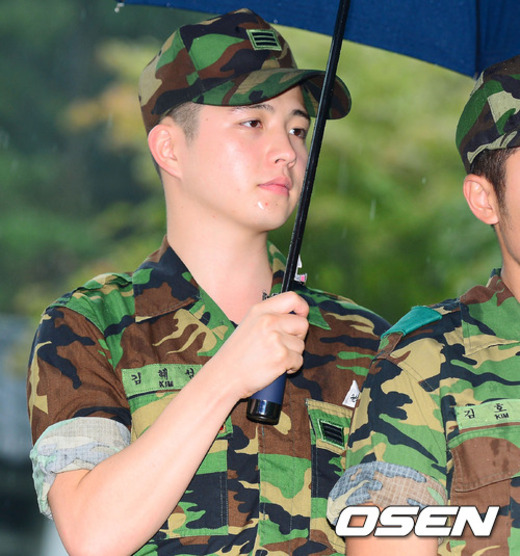 4일 오전 경기도 용인시 처인구 3군 사령부 앞에서 전역한 배우 정경호를 배웅 나온 배우 김혜성 상병이 전역식을 지켜보고 있다.