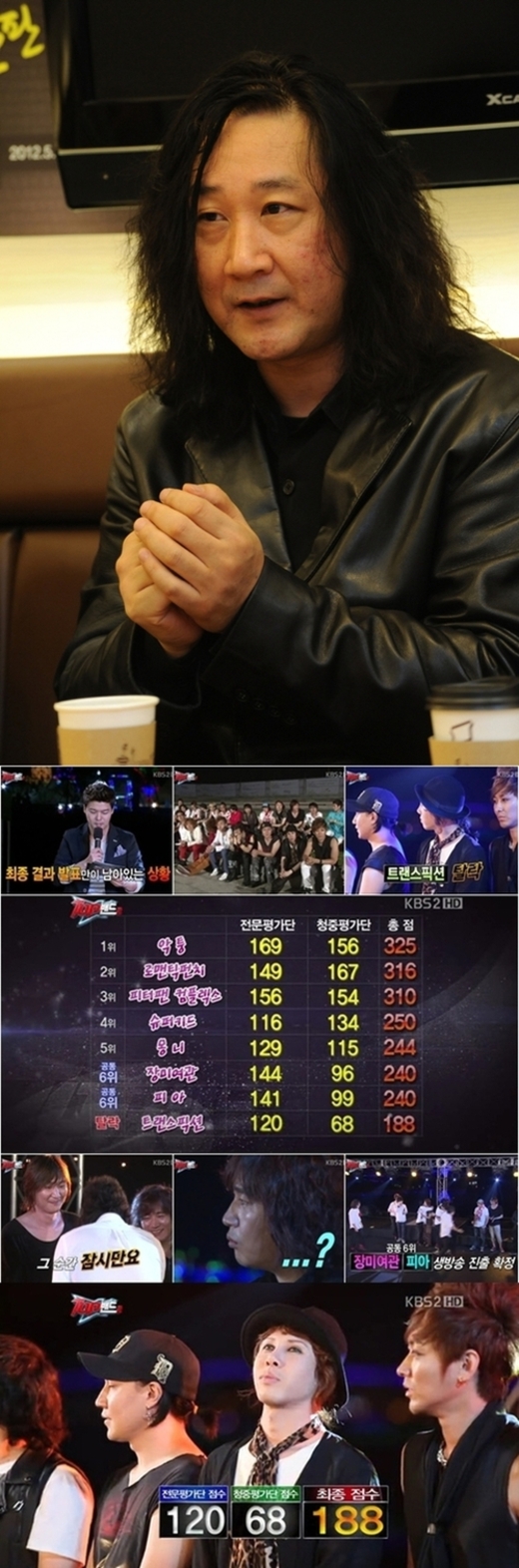지난 1일 방송된 ‘탑밴드2’는 2012 인천 펜타포트 록 페스티벌에서 진행된 8강전이 전파를 탔는데 유일하게 트랜스픽션이 탈락하며 코치인 김도균 역시 동반 하차하는 결과를 낳았다.