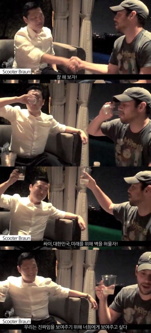 스쿠터 브라운은 4일 오후 YG블로그를 통해 게재된 싸이와의 술자리 영상에서 "싸이와 내가 캘리포니아에서 4일을 함께 지냈다. 우리는 친구가 되었고 새 역사를 쓸 준비가 됐다. 싸이는 미국에서 큰 성공을 거두는 첫 한국 아티스트가 될 것이다"라는 포부를 밝혔다.
