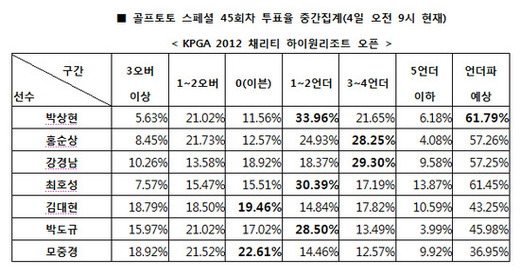 국민체육진흥공단(www.kspo.or.kr)이 발행하는 체육진흥투표권 수탁사업자인 스포츠토토 공식 온라인 발매 사이트인 베트맨(www.betman.co.kr)은 오는 6일 하이원컨트리클럽에서 열리는 'KPGA 2012 채리티 하이원리조트 오픈' 1라운드를 대상으로 한 골프토토 스페셜 45회차에서 전체 참가자의 61.79%가 박상현의 언더파 활약을 예상했다고 밝혔다.
