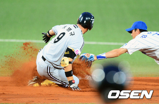 4일 오후 대구 시민구장에서 열린 '2012 팔도 프로야구' 삼성 라이온즈와 LG 트윈스의 경기에서 2회초 1사 주자 없는 상황에서 LG 이병규가 중견수 오른쪽 2루타를 날린 후 2루에 몸을 날리며 세이프되고 있다.