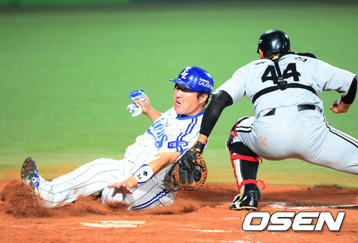 4일 오후 대구 시민구장에서 열린 '2012 팔도 프로야구' 삼성 라이온즈와 LG 트윈스의 경기에서 2회말 1사 주자 3루 삼성 신명철의 중견수 플라이 아웃때 3루 주자 최형우가 홈으로 쇄도, LG 윤요섭 포수에게 태그아웃 당하고 있다.