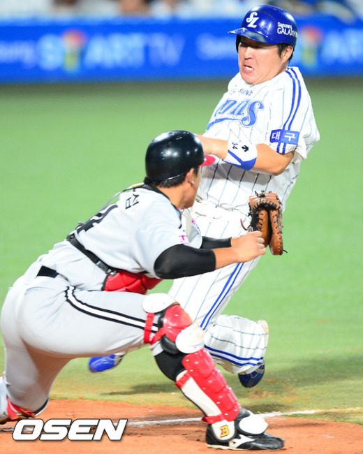 4일 오후 대구 시민구장에서 열린 '2012 팔도 프로야구' 삼성 라이온즈와 LG 트윈스의 경기에서 2회말 1사 주자 3루 삼성 신명철의 중견수 플라이 아웃때 3루 주자 최형우가 홈으로 쇄도, LG 윤요섭 포수에게 태그아웃 당했다.