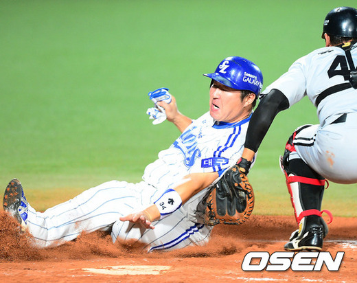 4일 오후 대구 시민구장에서 열린 '2012 팔도 프로야구' 삼성 라이온즈와 LG 트윈스의 경기에서 2회말 1사 주자 3루 삼성 신명철의 중견수 플라이 아웃때 3루 주자 최형우가 홈으로 쇄도, LG 윤요섭 포수에게 태그아웃 당하고 있다.