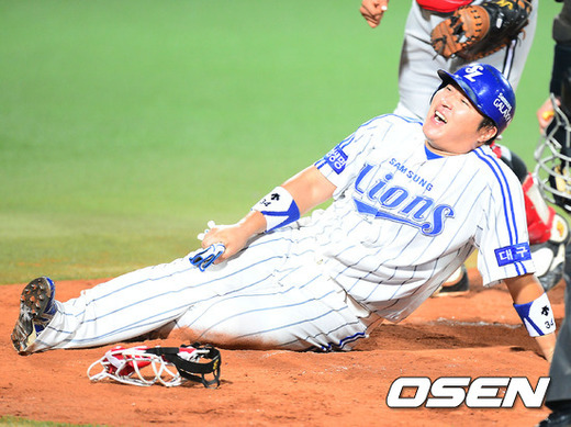 4일 오후 대구 시민구장에서 열린 '2012 팔도 프로야구' 삼성 라이온즈와 LG 트윈스의 경기에서 2회말 1사 주자 3루 삼성 신명철의 중견수 플라이 아웃때 3루 주자 최형우가 홈으로 쇄도, LG 윤요섭 포수에게 태그아웃 당한 후 아쉬워하고 있다.