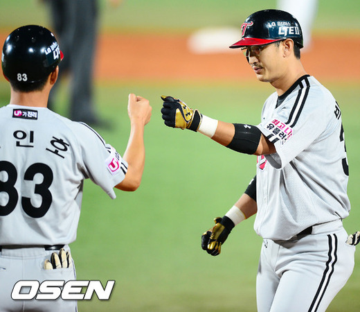4일 오후 대구 시민구장에서 열린 '2012 팔도 프로야구' 삼성 라이온즈와 LG 트윈스의 경기에서 3회초 1사 주자 2루 LG 박용택이 중견수 앞 1타점 적시타를 날린 후 1루에서 김인호 코치와 하이파이브를 하고 있다.