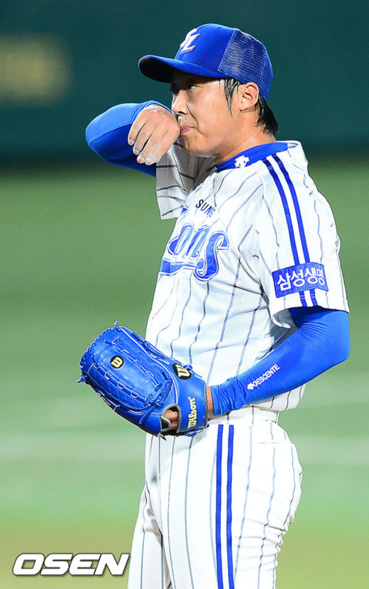 4일 오후 대구 시민구장에서 열린 '2012 팔도 프로야구' 삼성 라이온즈와 LG 트윈스의 경기에서 3회초 1사 주자 만루 LG 이병규 타석에서 삼성 선발 배영수가 땀을 닦고있다.