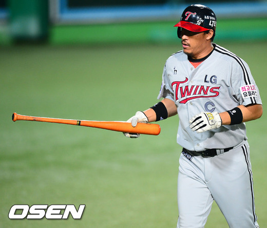 4일 오후 대구 시민구장에서 열린 '2012 팔도 프로야구' 삼성 라이온즈와 LG 트윈스의 경기에서 6회초 2사 주자 3루 LG 윤요섭이 중견수 앞 1타점 적시타때 홈을 밟은 이병규가 서동욱을 향해 배트로 사인을 보내고 있다.