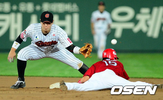4일 오후 부산 사직구장에서 열린 '2012 팔도 프로야구' 롯데 자이언츠와 KIA 타이거즈의 경기 7회초 2사 1루 김선빈의 타석, 1루주자 이용규가 도루에 성공하고 있다.