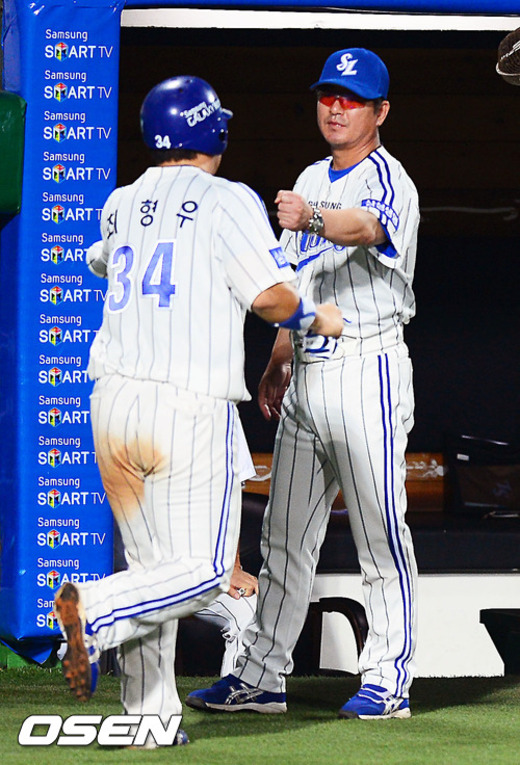 4일 오후 대구 시민구장에서 열린 '2012 팔도 프로야구' 삼성 라이온즈와 LG 트윈스의 경기에서 6회말 무사 주자 2루 삼성 박한이의 중견수 앞 1타점 적시타때 홈을 밟은 최형우가 덕아웃에서 류중일 감독과 하이파이브를 하고 있다.