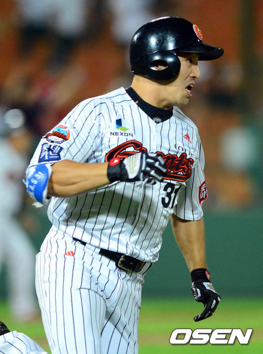 4일 오후 부산 사직구장에서 열린 '2012 팔도 프로야구' 롯데 자이언츠와 KIA 타이거즈의 경기 7회말 2사 만루 손아섭이 3타점 2루타를 친 후 달리고 있다.